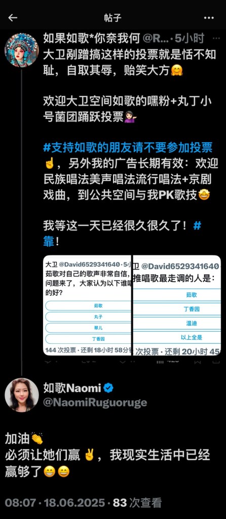我们说说她唱歌的事儿,这更是笑料百出。一次,一个女网友坦诚说自己唱歌不好,她的反应是:“只要我不难看,难看的就是别人。” 逻辑完全错乱。