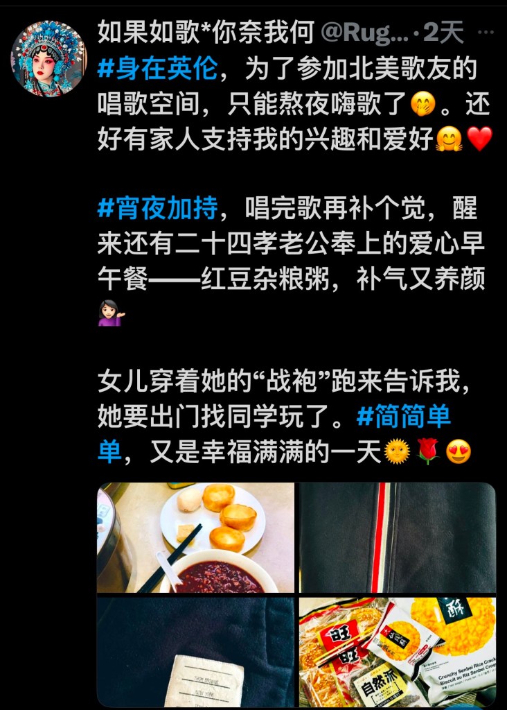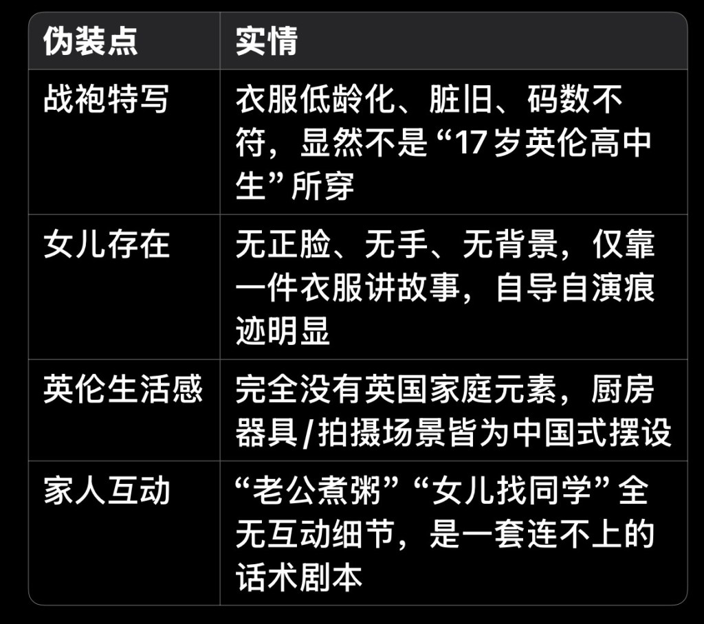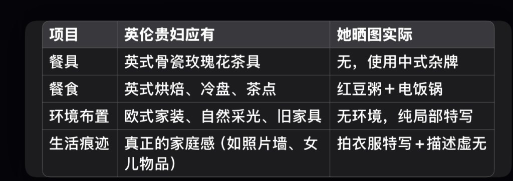 她说“英伦贵妇生活”,晒的却是电饭锅上写满简体字,厨房油腻得像郊区出租屋的公共灶台;她说“宵夜加持唱北美空间”,但整个空间除了她在鬼吼鬼叫,没人听得下去;她说“二十四孝老公煮粥”,结果连粥碗都是淘宝风“养颜瓷碗”P上去的。
