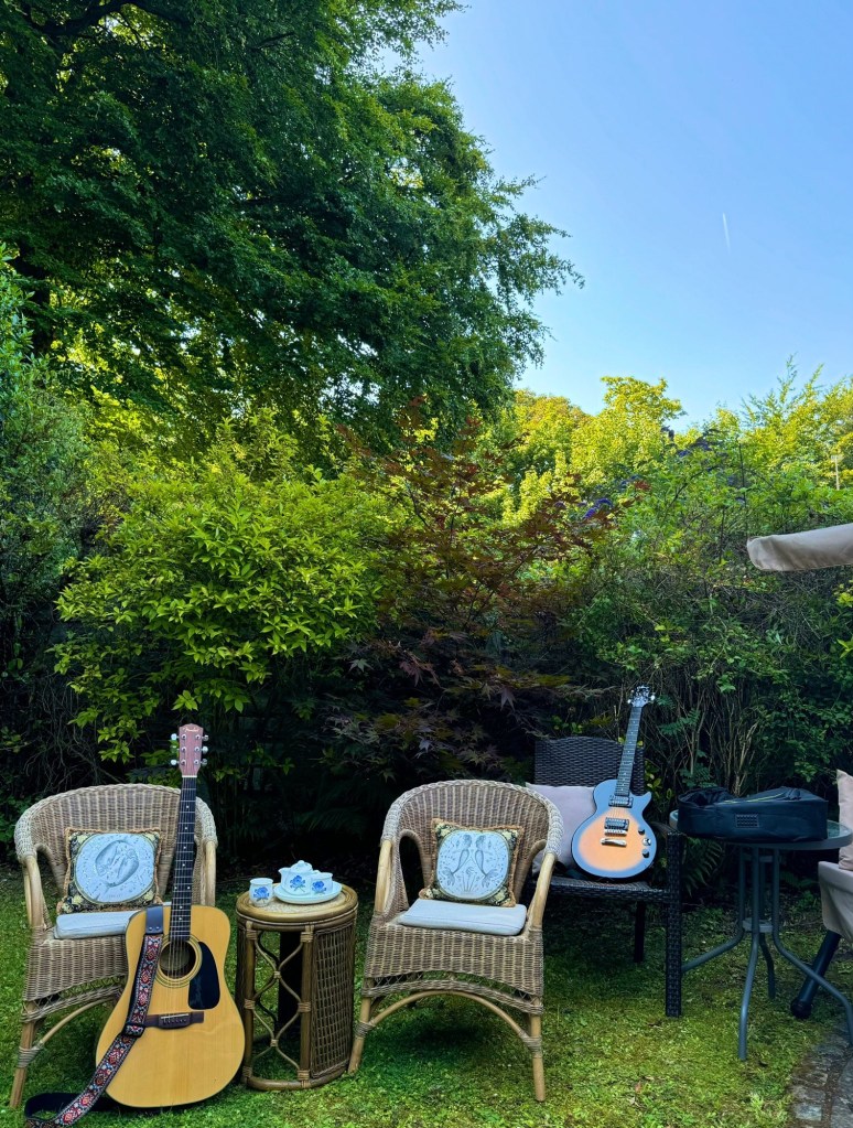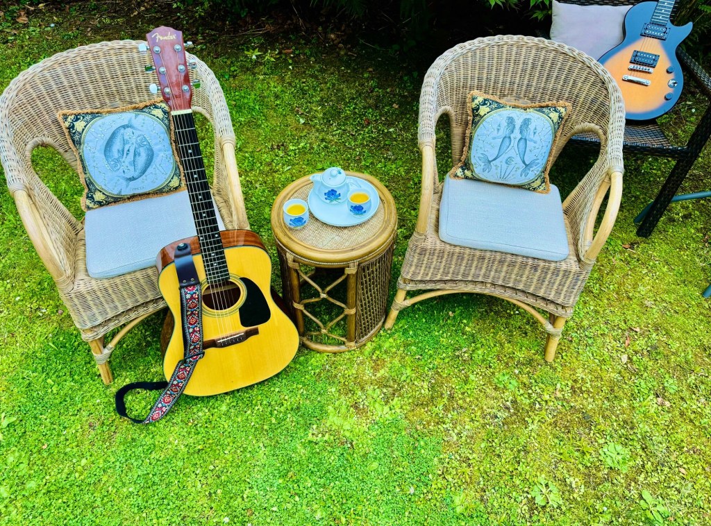 一壶茶,两杯瓷,一把木吉他,一把电吉他,然后旁边搭一个烤炉桌和电子设备桌。