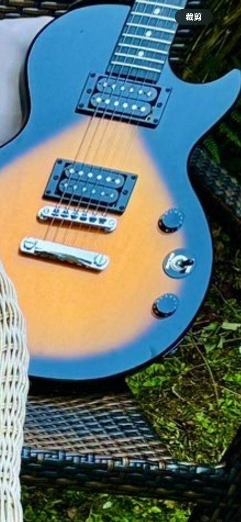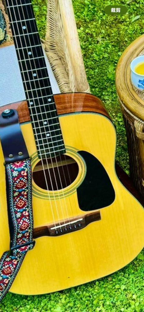 再说那个电吉他,整张图里唯一的金属质感,和乡村藤椅的视觉毫无搭配感,像个路人突然闯进了拍摄棚,打断了所有剧情。